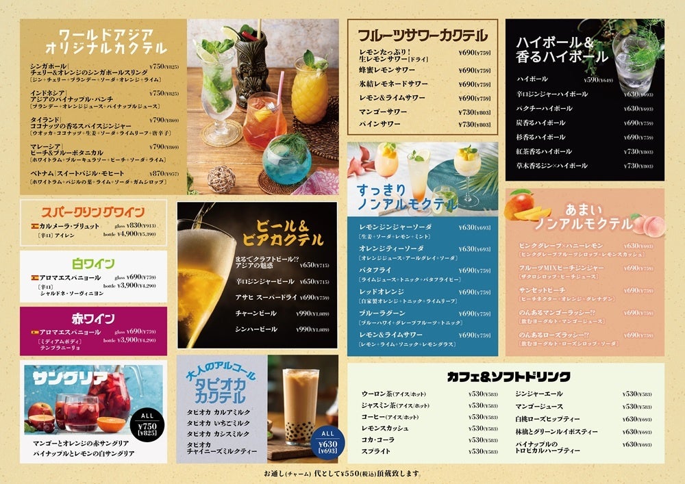 他にも、トロピカルな「ワールドアジアオリジナルカクテル」や「フルーツサワー」など、写真映え抜群のドリンクも充実。