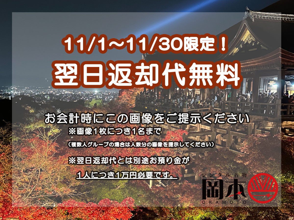 紅葉映える夜のライトアップに着物で京都を散策しませんか?レンタル着物岡本では2025年11月1日(金)~11月30日(日)の期間限定で「翌日返却オプション」が無料になる特別キャンペーンを実施します。