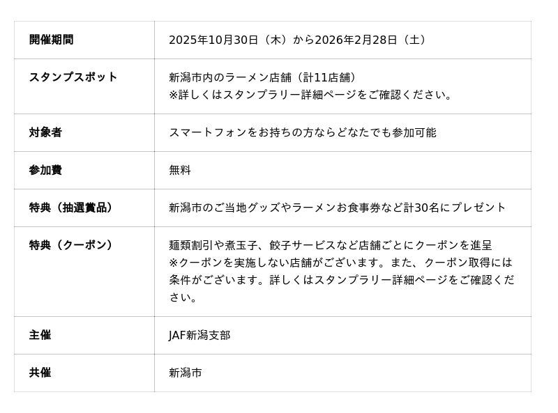 一般社団法人日本自動車連盟(JAF)新潟支部(支部長・町田 一越)は、10月30日(木)から2026年2月28日(土)までの間、「ラーメン王国1位を目指せ!新潟市ラーメンスタンプラリー」を開催します。