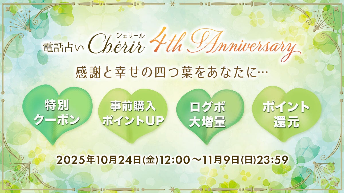 株式会社ザッパラスのグループ会社である株式会社コンコース(代表取締役:川崎正人)は、運営する電話占い『Cherir(シェリール)』がサービス開始より4周年を迎えたことを記念して、2025年10月24日(金)より「4周年記念キャンペーン」を開催中です。