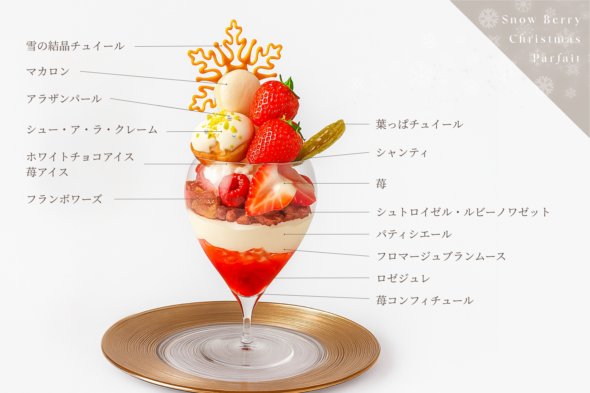 2025年のクリスマスを彩る限定パフェは、苺の甘酸っぱさとやさしいミルクの余韻が心をほどくように広がる、華やかで上品な一品。