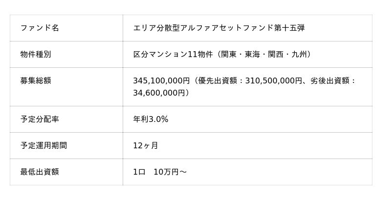 『エリア分散型アルファアセットファンド第十五弾』は、穴吹興産が全国で保有する物件の中から厳選した、関東・東海・関西・九州に点在する優良物件11物件が投資対象です。賃料収入を原資として投資家の皆様へ配当を行う「インカム型」ファンドとなります。