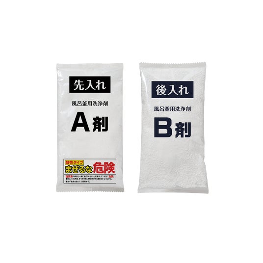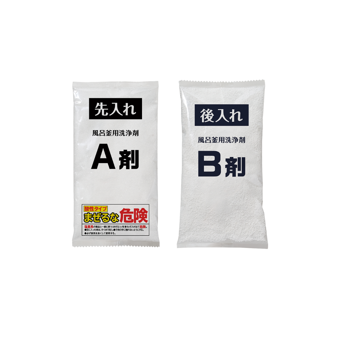 成分:A剤:スルファミン酸(94%)、クエン酸 / B剤:過炭酸ナトリウム、炭酸ナトリウム、重炭酸ナトリウム、抗菌剤(銀ゼオライト)