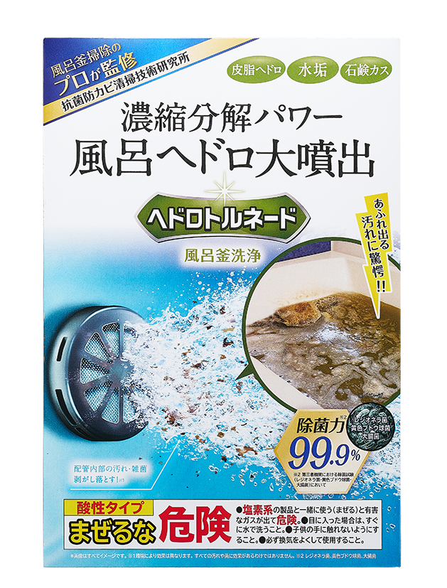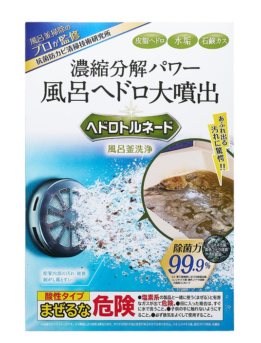 『ヘドロトルネード』は、風呂釜配管の奥に潜むヘドロ汚れを一気に洗い流す風呂釜洗浄剤です。