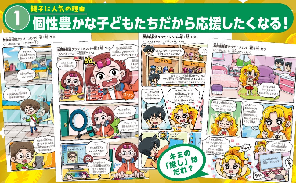 そんな疑問を、4人の小学生たちが“放課後投資クラブ”で楽しく学んでいくストーリー仕立て。専門家のジョン先生から出されるミッションに挑戦しながら、泣いて笑ってぶつかって、少しずつ「お金の本質」に気づいていきます。