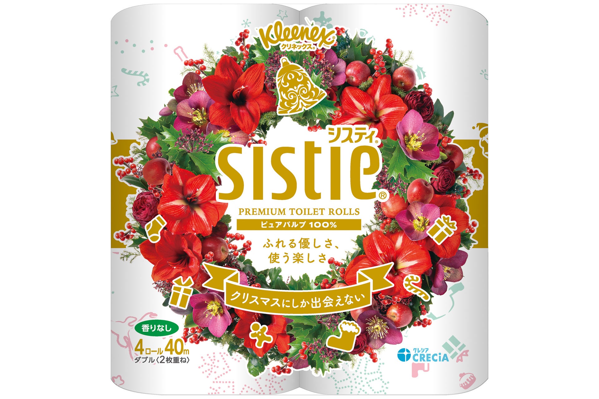 ■『クリネックス システィ クリスマス』赤い花々のリースをあしらったデザインに加え、ロール本体にもクリスマスモチーフのイラストを使用。
