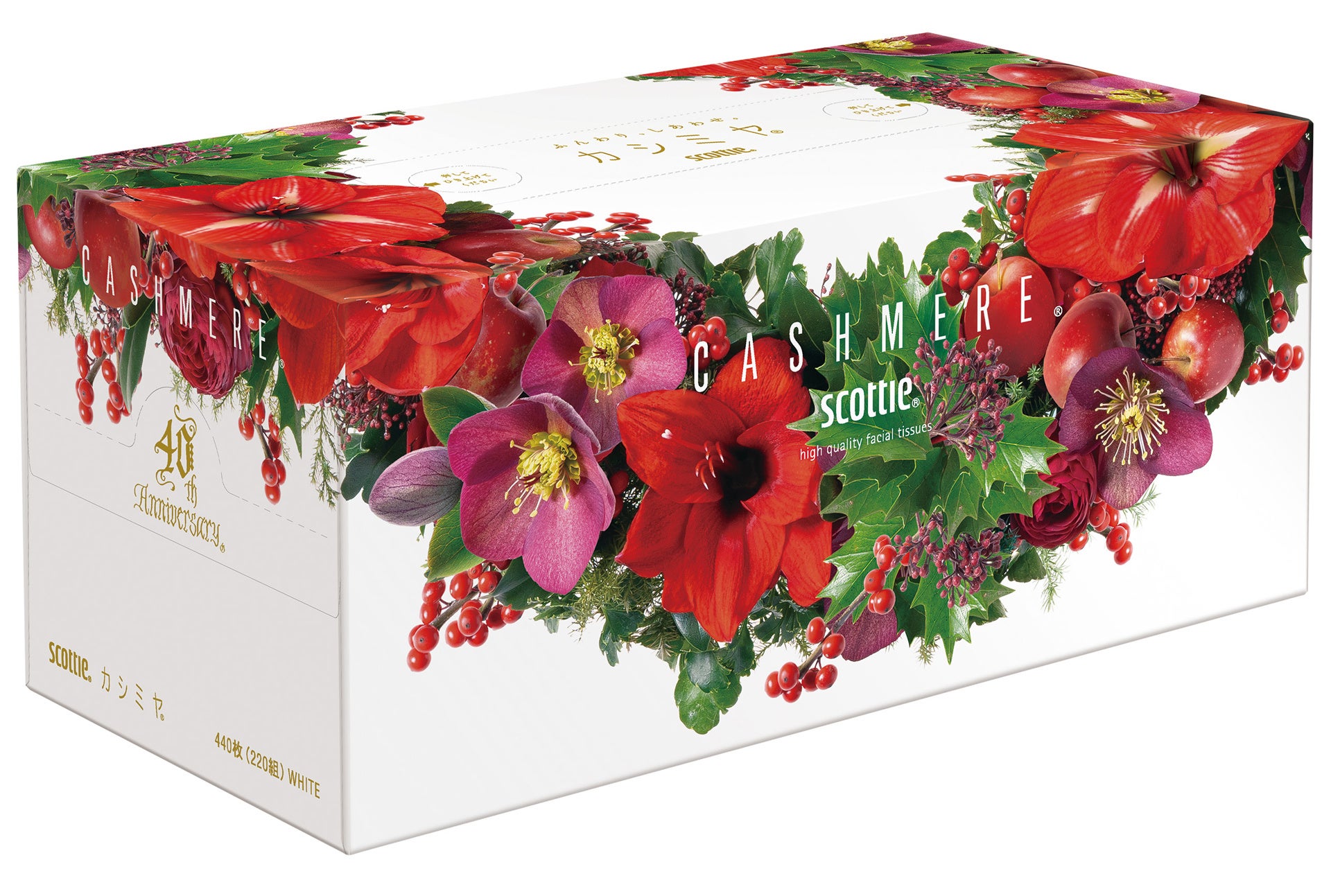 ■『スコッティ カシミヤ クリスマス』今年発売40周年を迎える『スコッティ カシミヤ』の数量限定パッケージ。カシミヤならではの白いボックスに、赤い花々を中心としたクリスマスリースを全面にあしらった特別なデザインです。