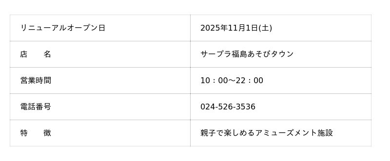 JR東日本東北総合サービス株式会社(本社:宮城県仙台市、代表取締役:弭間 俊則) が運営する福島駅西口パワーシティピボット(福島県福島市栄町1-1)において、サープラ福島あそびタウンが2025年11月1日(土)移転リニューアルオープンいたします。