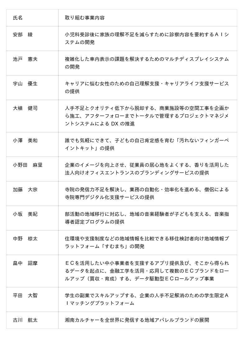 県では、地域発の起業家を次々と生み出す「HATSU 起業家支援プログラム」として、起業を目指す有望な起業準備者“チャレンジャー”を募集・採択し、起業の実現に向けた伴走型集中支援を実施しています。 このたび、厚木市内の起業家創出拠点「AGORA Hon-atsugi」において、県が支援する令和7年 度「AGORA Hon-atsugiチャレンジャー(後期)」12 名を決定しましたので、お知らせします。