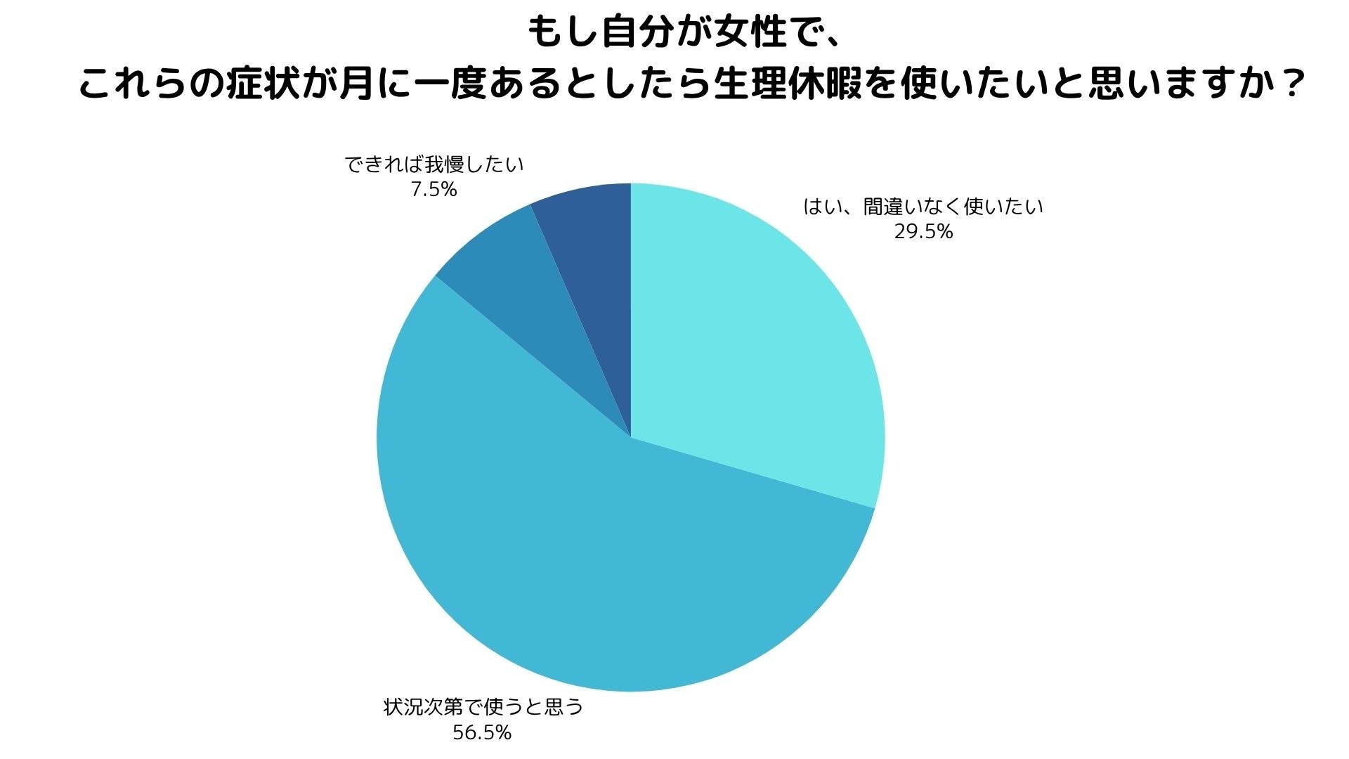 「もし自分が女性で、月に一度これらの症状があるとしたら生理休暇を使いたいと思いますか?」という質問に対し、「間違いなく使いたい」29.5%、「状況次第で使うと思う」56.5%と、約9割の男性が使いたいと回答しました。