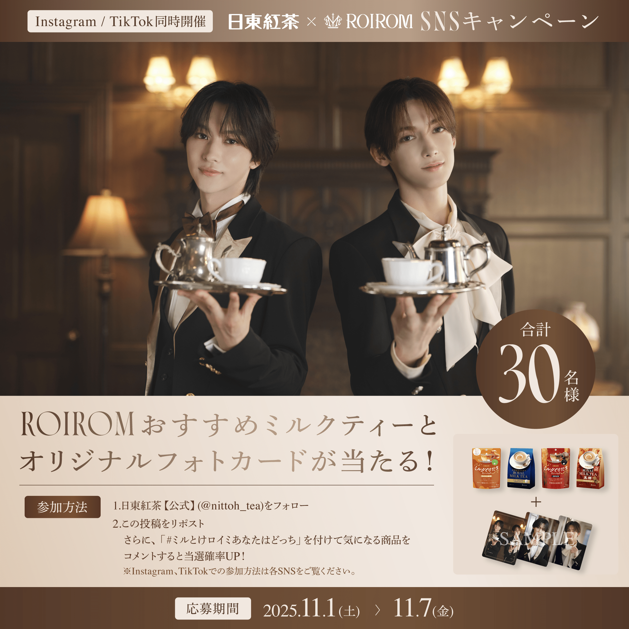 WebCMの公開を記念して、「ROIROM」がセレクトしたミルクティーセットが当たるSNSキャンペーンや、レシートで応募すると「ROIROM」直筆サイン入りチェキ、オリジナルグッズなどがもらえるキャンペーン「ROIROMとごぼうびミルクティーキャンペーン」を開催いたします。◆フォロー&リポスト/コメントで「ROIROMおすすめミルクティーセット」が当たる!SNSキャンペーン
