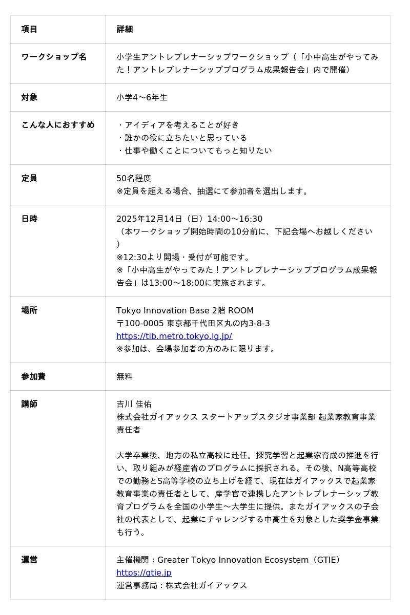 産学官と連携したアントレプレナーシッププログラムを提供する株式会社ガイアックスは、首都圏を中心とした大学等から構成する『世界を変える大学発スタートアップを育てる』プラットフォーム「Greater Tokyo Innovation Ecosystem(GTIE:ジータイ)」と連携し、小学生を対象としたアントレプレナーシップワークショップを開催します。