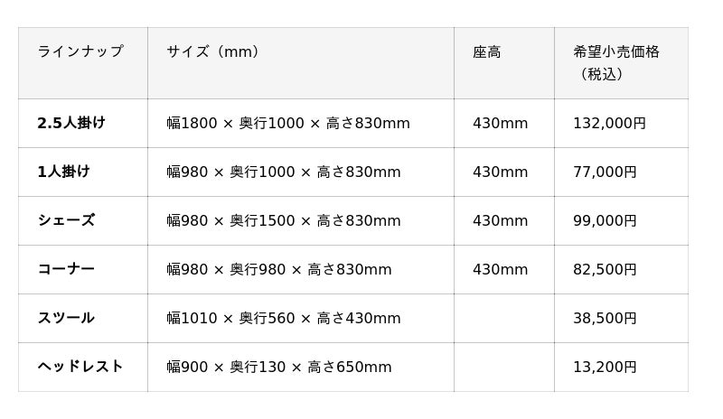 オフトシリーズは、2.5人掛け、1人掛け、シェーズ、コーナー、スツールの5サイズと専用のヘッドレストの合計6製品をラインナップ。価格帯は、38,500円~132,000円(税込)です。