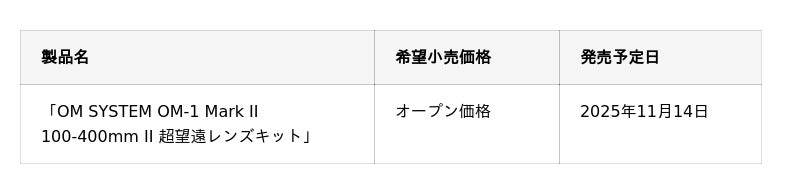 OMデジタルソリューションズ株式会社(代表取締役社長 兼 CEO:杉本 繁実)が展開する映像製品ブランド「OM SYSTEM」は、フラッグシップモデルのミラーレス一眼カメラ「OM SYSTEM OM-1 Mark II」に、200-800mm相当(※1)の超望遠領域をカバーする「M.ZUIKO DIGITAL ED 100-400mm F5.0-6.3 IS II」と双眼鏡を組み合わせた「OM-1 Mark II 100-400mm II 超望遠レンズキット」を2025年11月14日から数量限定で発売します。