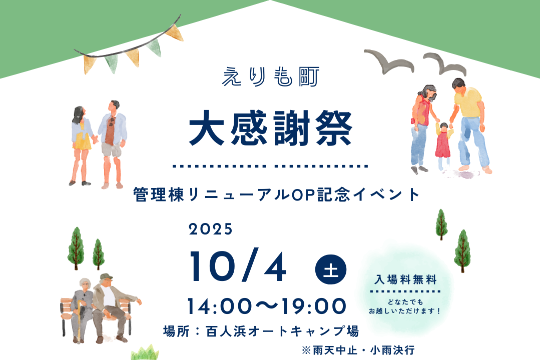 北海道えりも町にあるキャンプ場「百人浜オートキャンプ場」(運営:株式会社FoundingBase(本社:東京都世田谷区、代表取締役:山本賢司、以下「FoundingBase」)は、10月4日に「えりも町大感謝祭~管理棟リニューアルオープン記念イベント~」を開催しました。