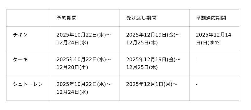 (1) 早割 フライドチキン(10ピース)およびコンボ(10ピース)を、12月14日(日)までにご予約いただくと、特別価格でご購入いただけます。