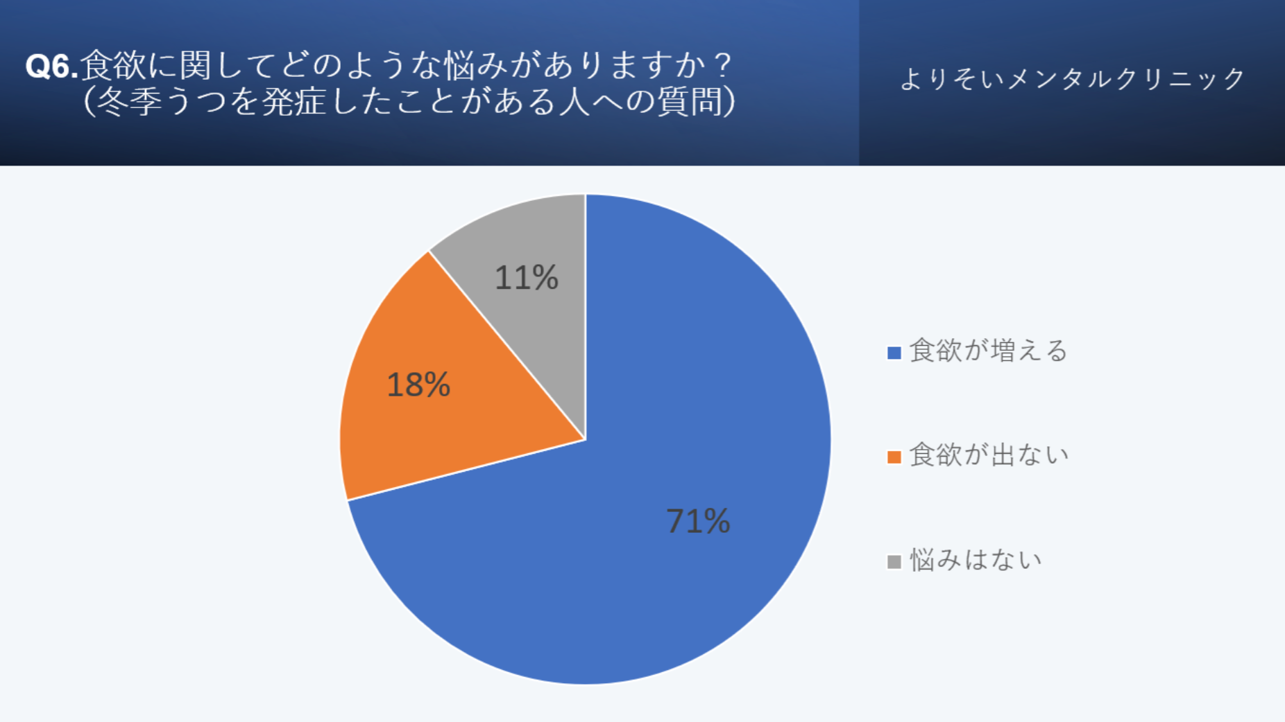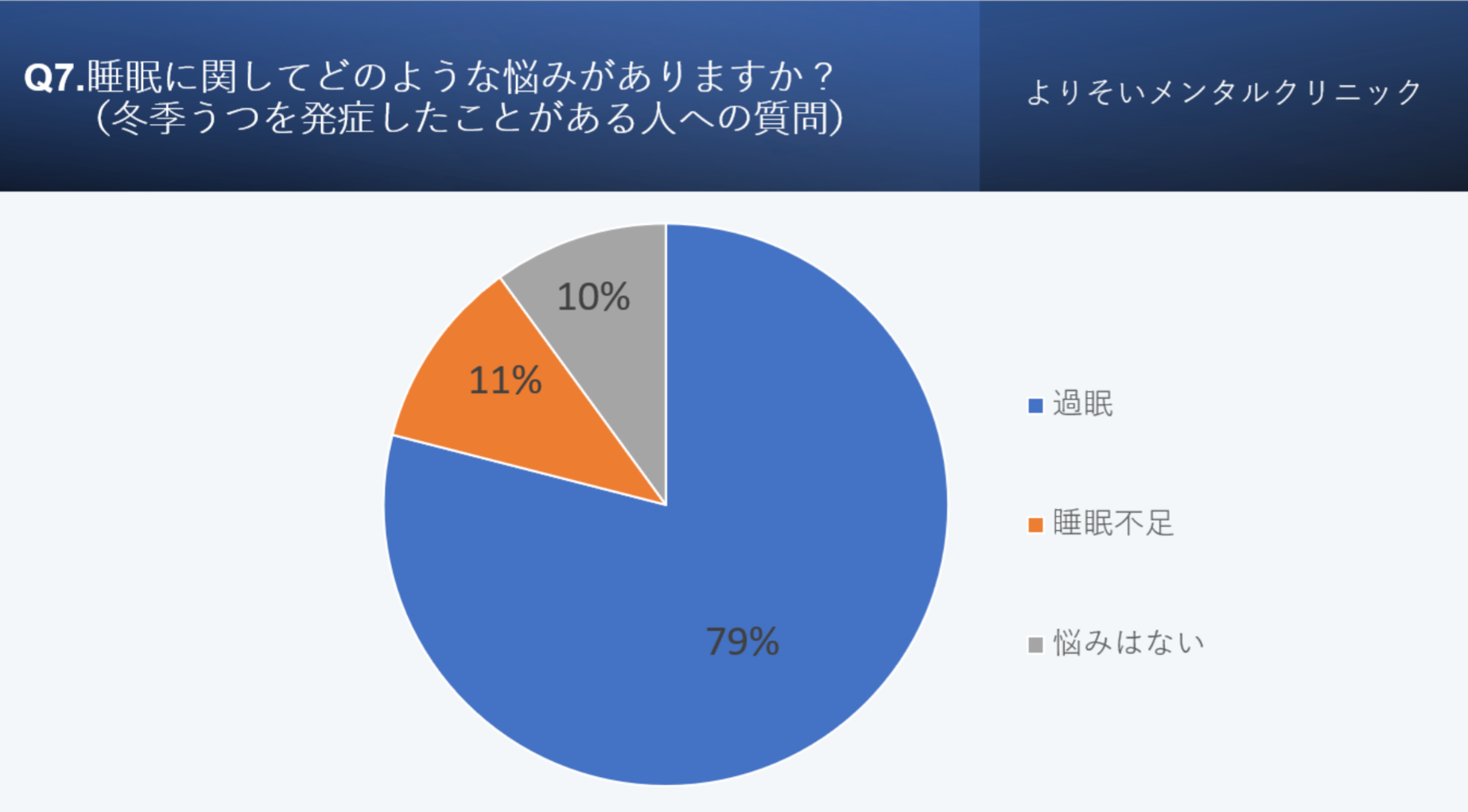 今回は、冬季うつに関して調査しました。冬季うつになると、食欲増加・睡眠過多・体重増加などが起こりやすく、一般的なうつとは症状が異なると分かりました。