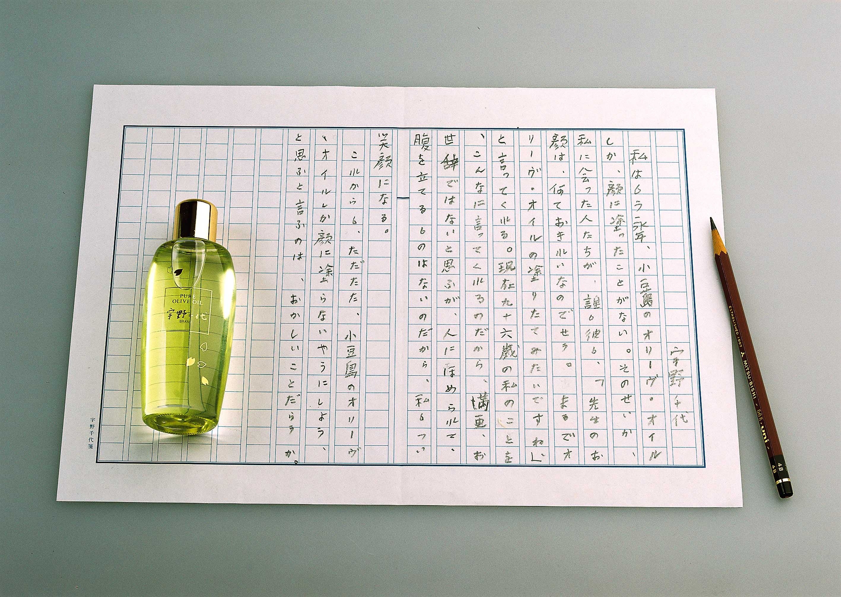 創業間もない頃からご縁をいただいた宇野千代先生の美しく年を重ねる素敵な生き方こそが、当社のオリーブ化粧品のフィロソフィーになっています。シンプルで自然なままの美しさを引き出すことのできるオリーブ化粧品づくりの原点は、まさに宇野千代先生からいただいた大切な宝物です。新発売の化粧品でたくさんの方々の美のサポートができたら幸いです。