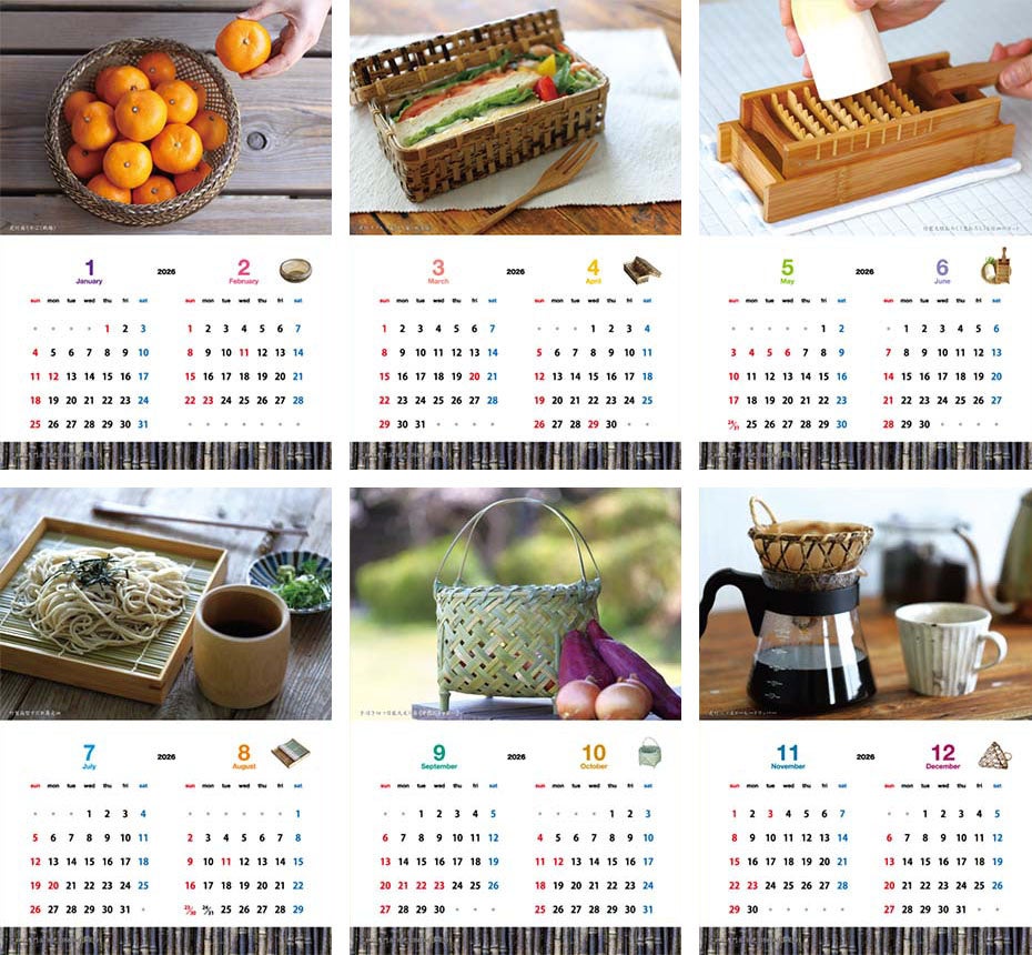 今回のカレンダーは、「竹×食」をテーマに制作。竹皮でおにぎりを包む、竹籠にみかんを盛る、竹皿で蕎麦を味わうなど、日本の食文化において、竹は古くから「食」をささえる素材として重宝されてきました。そんな竹と食の豊かな関係性を、暮らしに息づく竹の道具とともに紹介する内容となっています。毎ページごとに異なるアイテムの写真を掲載し、竹の魅力に触れるたびに、心豊かな気持ちになれるカレンダーです。