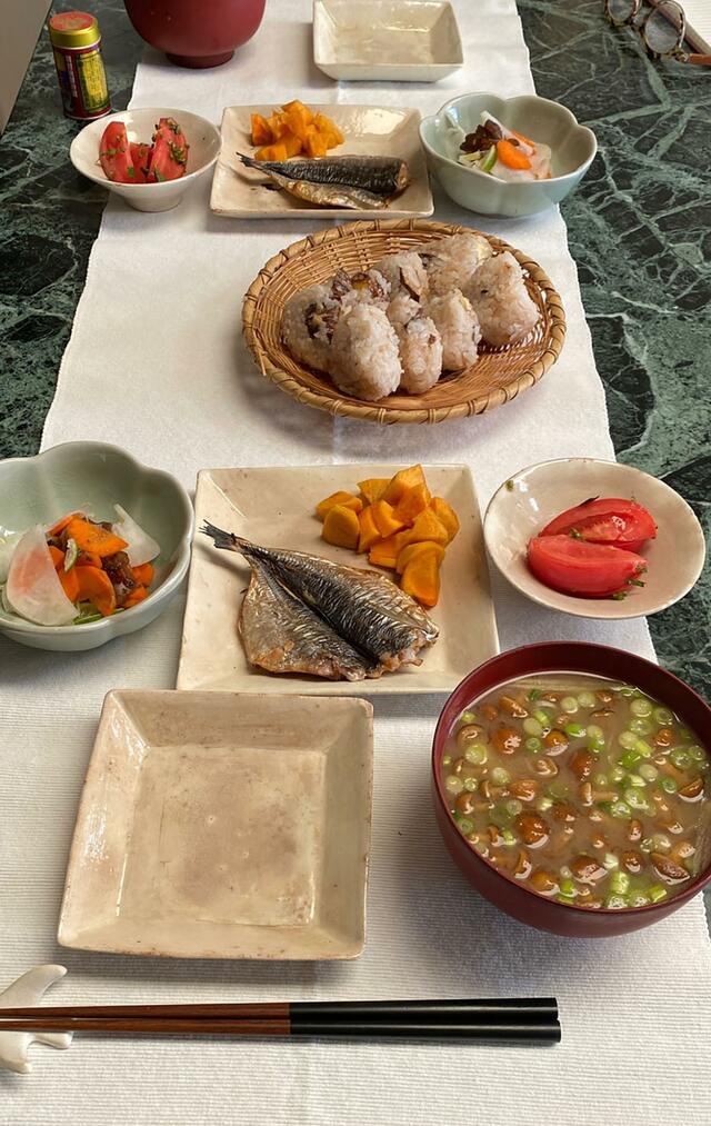 栗ごはんのおむすび、アジの干物、書き、トマト、ぬか漬けと小鯛のヅケ、なめこの味噌汁。鎌倉のスワニーまでバスを乗り継いで布を買いに行く。涼しくなってきたので、自分の洋服でも作ろうかな?という気分です。こっちの腕も素人ですが。
