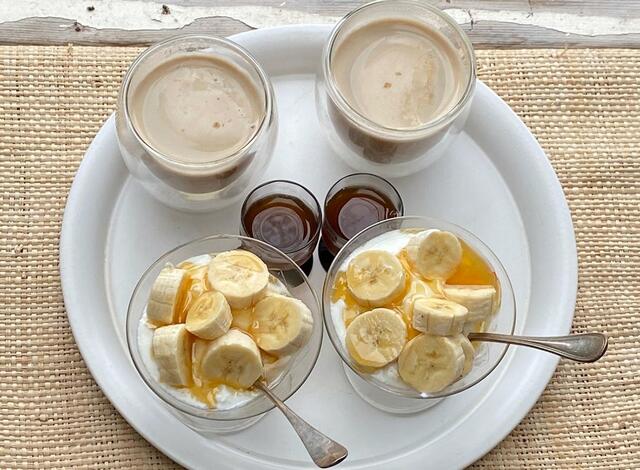 バナナヨーグルト、今日の元気、カフェ・オ・レ。