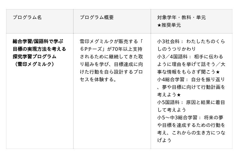 今回はその第六弾として、雪印メグミルク株式会社と連携した「総合学習/国語科で学ぶ目標の実現方法を考える探究学習プログラム」を提供いたします。