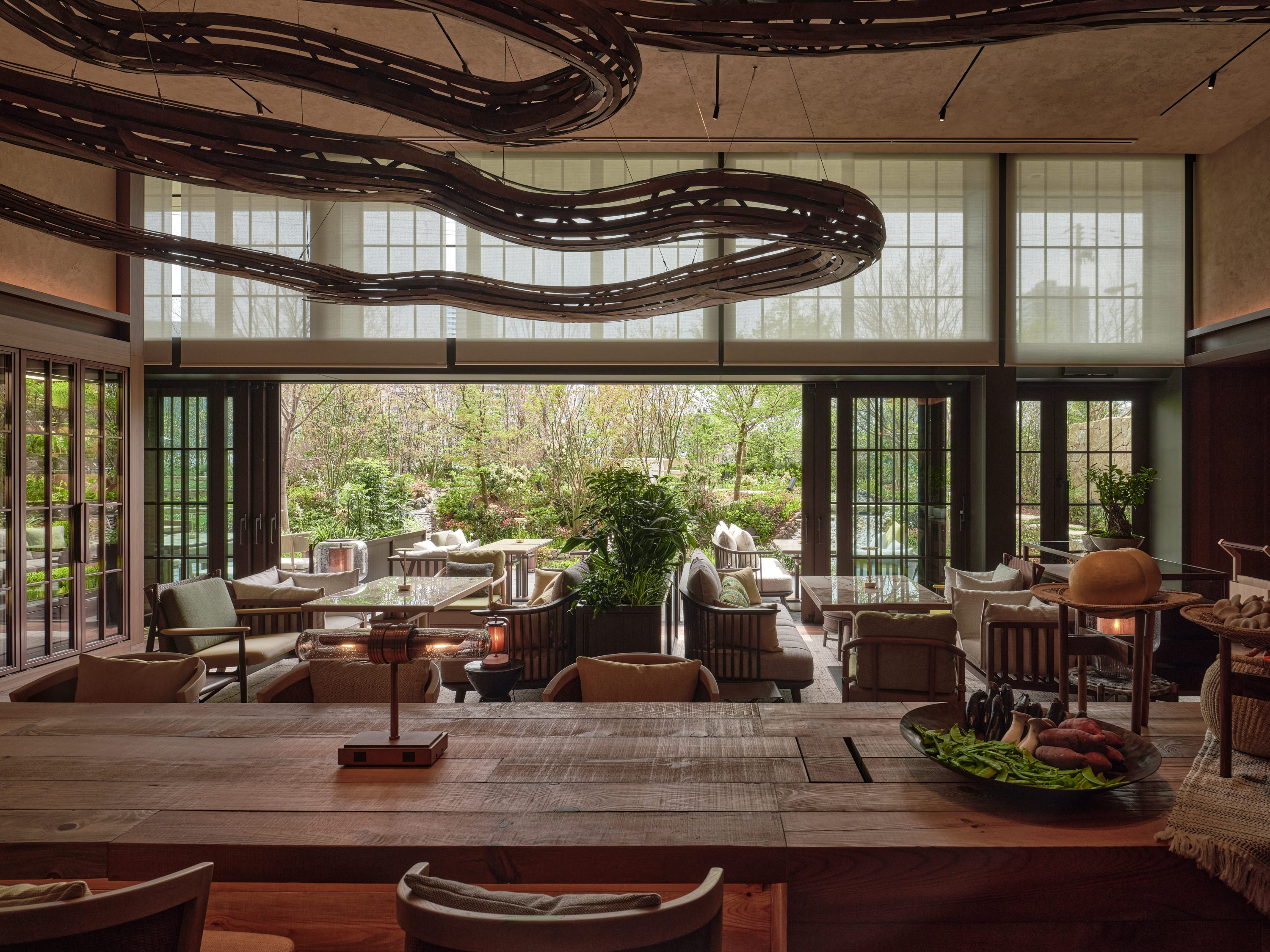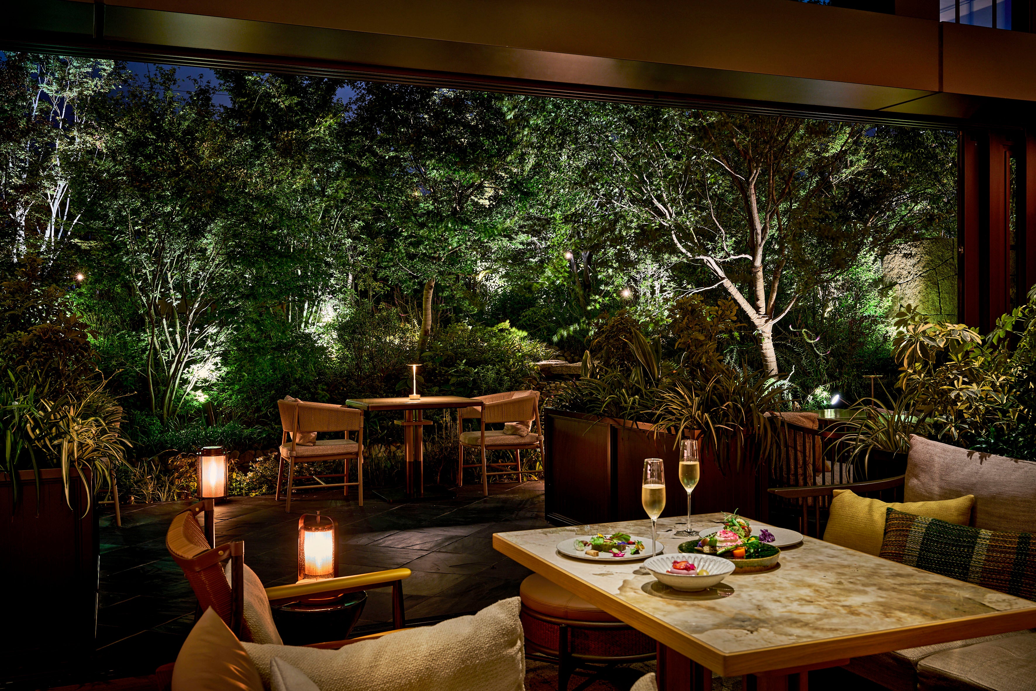 日本古来の暦「七十二候(しちじゅうにこう)」をコンセプトに、繊細に移ろう季節の変化に寄り添った料理を提供する「P72」。フェスティブシーズンには、蕪のグリルや発酵茸のラビオリなど有機野菜や発酵食材を使ったメニューに加え、紅ズワイガニのタルタルやあんこうのローストなど、この時期ならではの味覚が揃います。天気のよい日には、緑豊かなテラスで開放的なダイニングも。木の温もりと柔らかな灯りに包まれながら、旬の恵みを一皿ごとに味わう至福のひとときをお楽しみください。