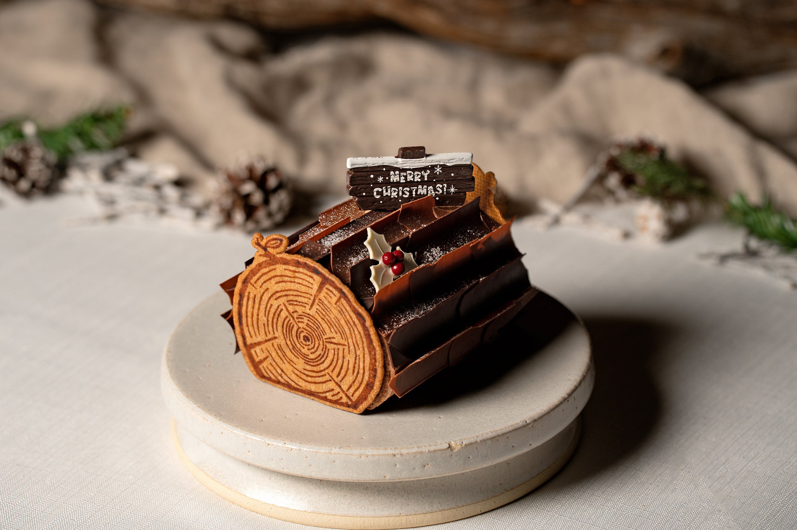 切り株をモチーフにしたロールケーキに、濃厚でなめらかなチョコレートクリームをたっぷりと包み込みました。アクセントのオレンジジャムは、ホテルの朝食などで使用したオレンジの皮を丁寧に再利用しじっくりと煮詰めた自家製。深い味わいとともにサステナブルな心意気も感じていただけます。