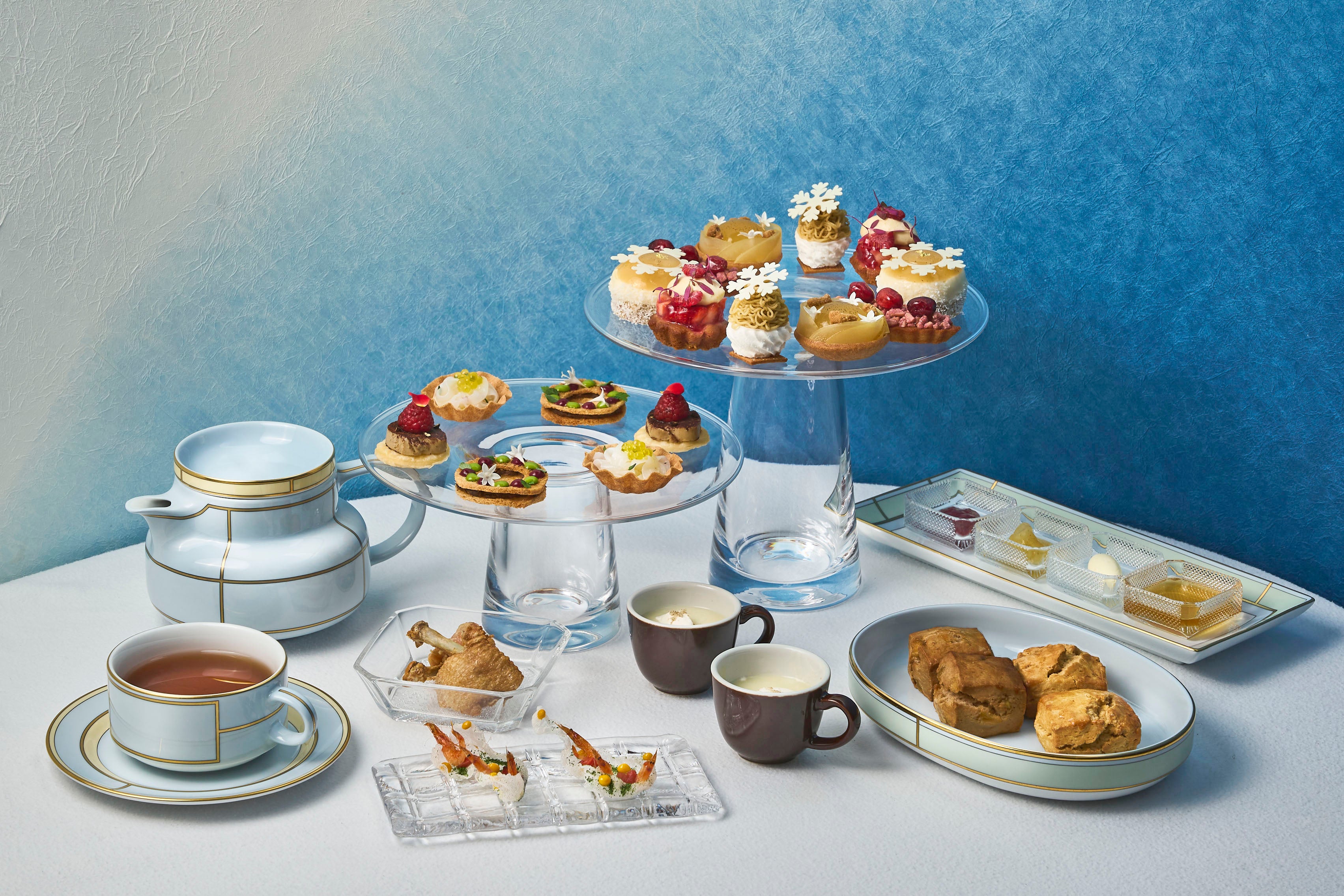 大阪城公園を一望するティーラウンジ「にじり」には、雪をイメージしたアフタヌーンティーがお目見えします。華やかな白と赤を基調としたスイーツには、雪の結晶をトッピングした洋梨とホワイトチョコレートのムース、りんごとチーズクリームのハーモニーが楽しめるアップルタタン、さくさくのメレンゲと濃厚なマロンの風味が絶妙な栗と洋梨のモンブランなど計5種類をご用意しました。バスク料理「IÑAKI」のキッチンからご提供するセイヴォリーは、フォアグラや自家製スモークのぶりなど本格的な味覚を取り揃えた計6種類がお楽しみいただけます。藍染めのグラデーションが美しい螺旋階段が象徴的な和の趣溢れる空間で、秋から冬へと装いを変える大阪城公園の景色を眺めながら、上質なひとときをご満喫ください。