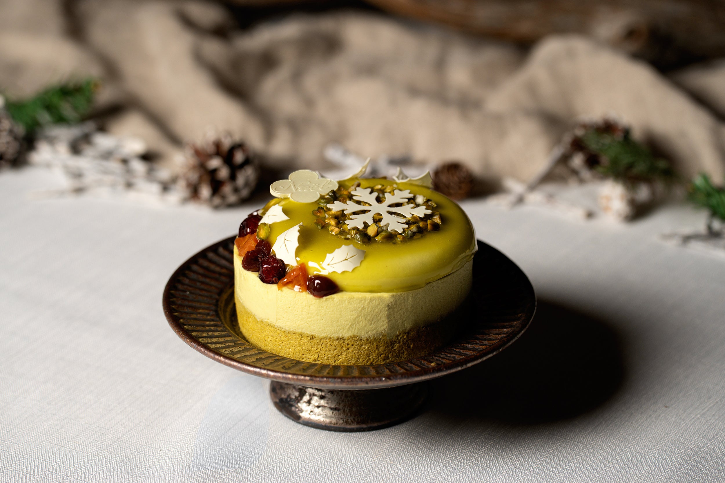 雪の結晶など冬のモチーフが華やかに彩る、ピスタチオのムースケーキ。中にはグリオットのコンポート入りチョコレートクリーム、ベリージュレ、ピスタチオムースが幾重にも重なり、奥行きのある味わいと上品な食感のコントラストを生み出します。豊かに香るピスタチオの風味を心ゆくまでお楽しみください。