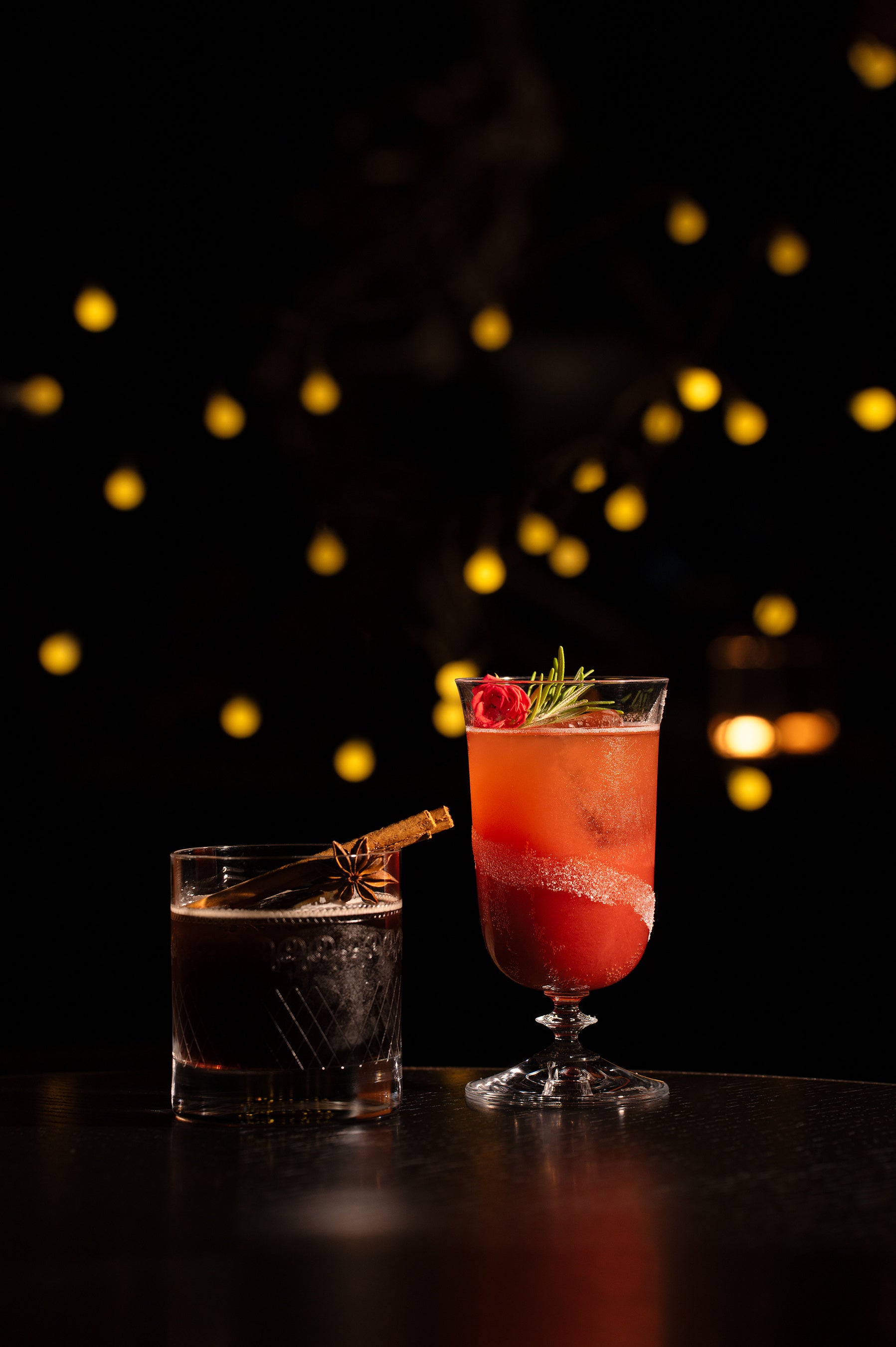 祝砲を意味するクラシックカクテル「フレンチ75」をベースに、クリスマスらしい特別感を演出する苺を使用したオリジナルカクテル「サルート」は、紅茶の香りと華やかな味わいが特徴です。さらに、ホリデーシーズンの定番であるスパイスの香るクリスマスエールをイメージした「ブラックノエル」もご用意。日本を代表するウイスキー「山崎」に、自家製スパイスシロップ、ギネスビール、バニラビターズを重ねた奥行きのある味わいが、冬の夜をあたたかく包み込みます。きらめく大阪の夜景とともに、この季節だけの特別な一杯をお楽しみください。