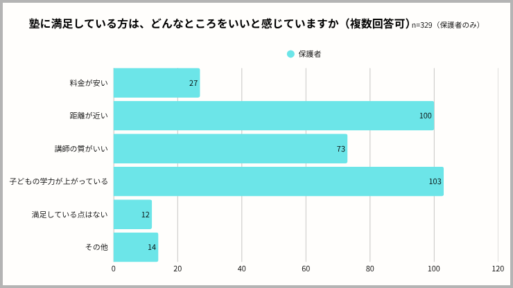 保護者に対して行った「塾に満足している方は、どんなところをいいと感じていますか」という質問では、僅差ではあるものの「子どもの学力が上がっている」が最も多い回答となりました。