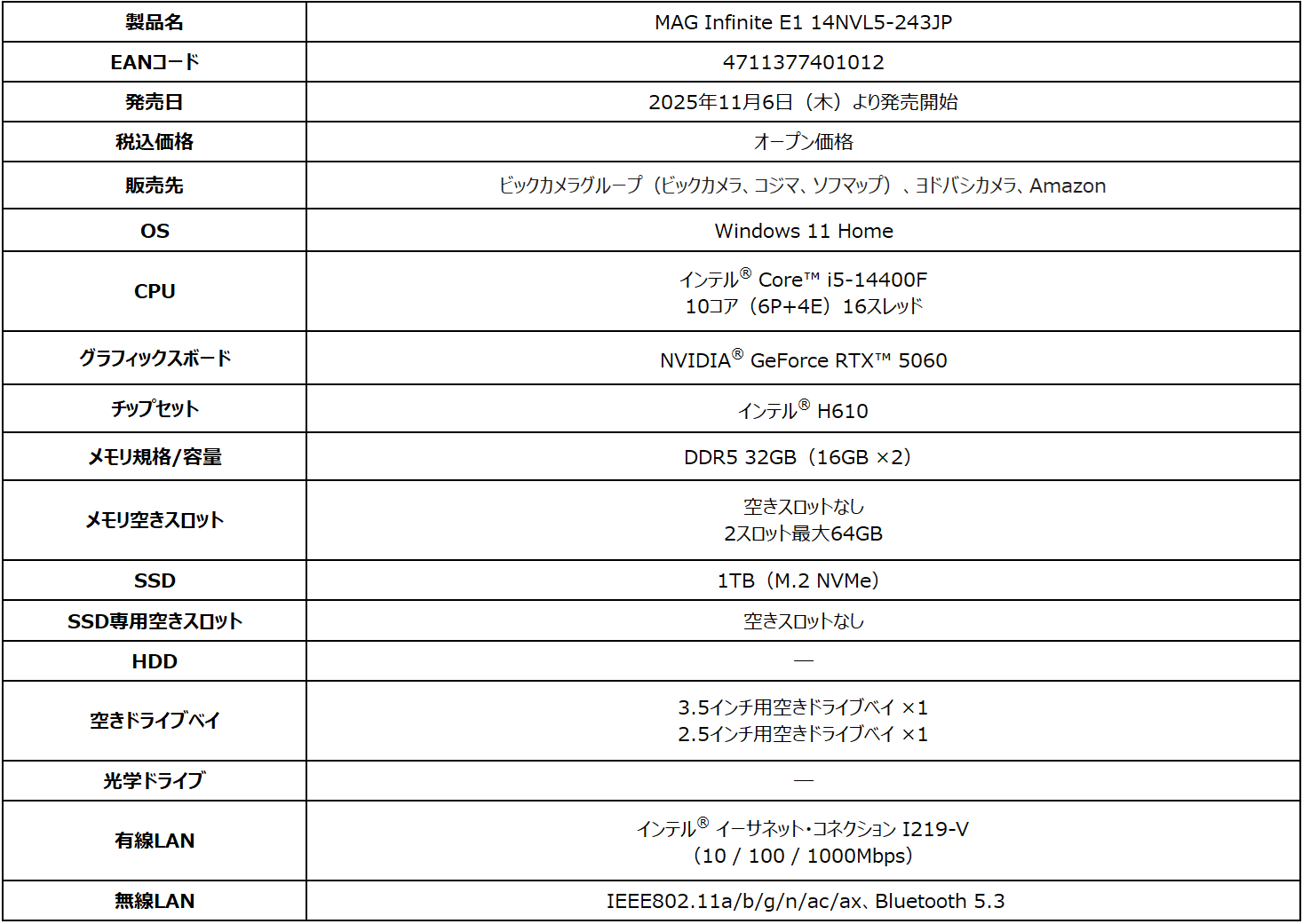 最新のゲーミング体験が得られるDLSS 4マルチフレーム生成に対応したNVIDIA(R) GeForce RTX(TM) 5060を搭載の、より高いフレームレートでのゲームプレイを実現し、大容量32GBメモリ、有線LAN・Wi-Fi 6E対応で設置環境を選ばず、コストパフォーマンスにも優れた「MAG Infinite E1 14NVL5-243JP」が新たにラインナップに加わります。