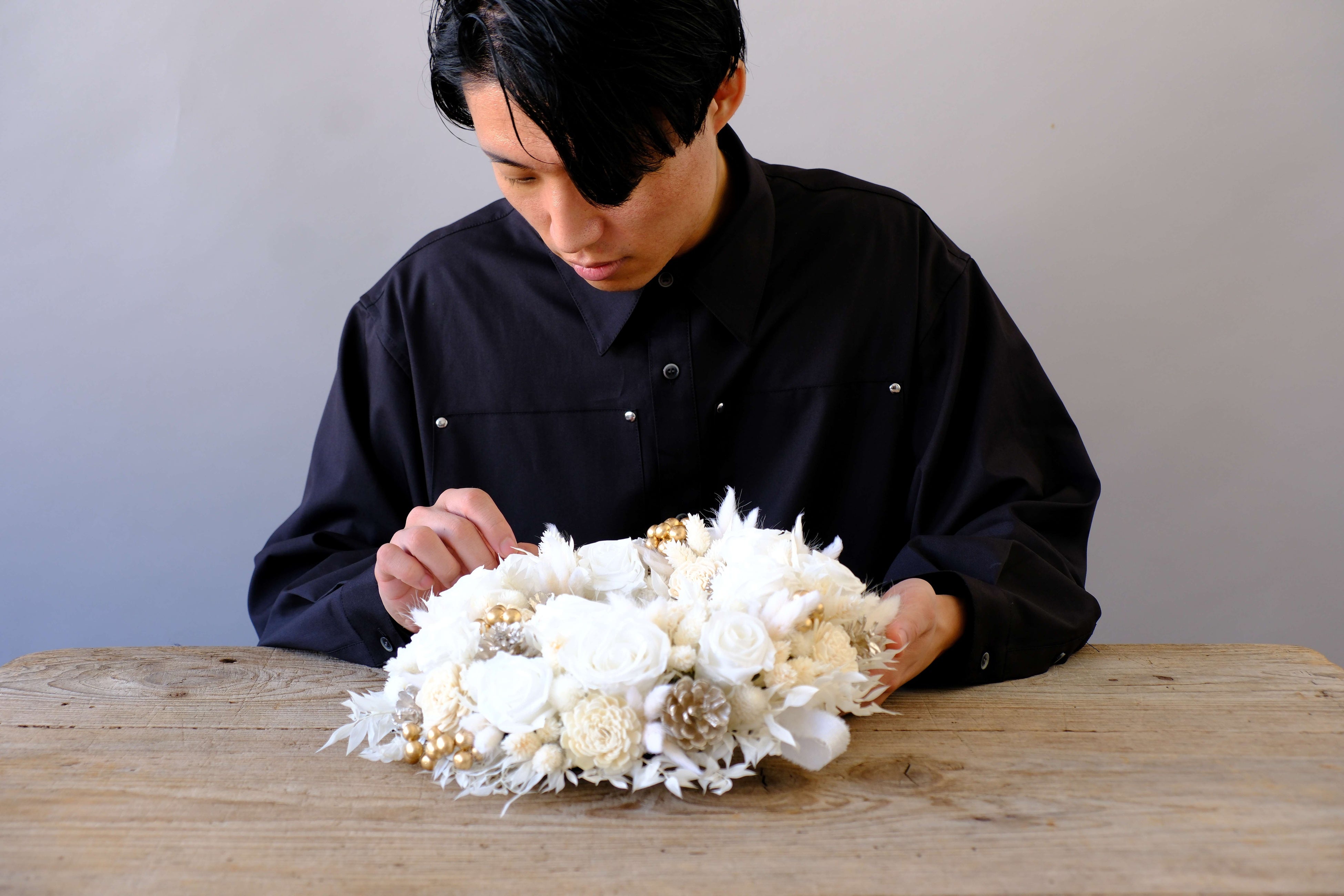 川口太聞日本一周を機に花の世界へ入り2年。社内コンテストで優秀な成績を残しコンペティション出場権を勝ち取り優勝、世界大会に出場した。帝国ホテル 大阪フラワースタジオ所属のフローリスト。