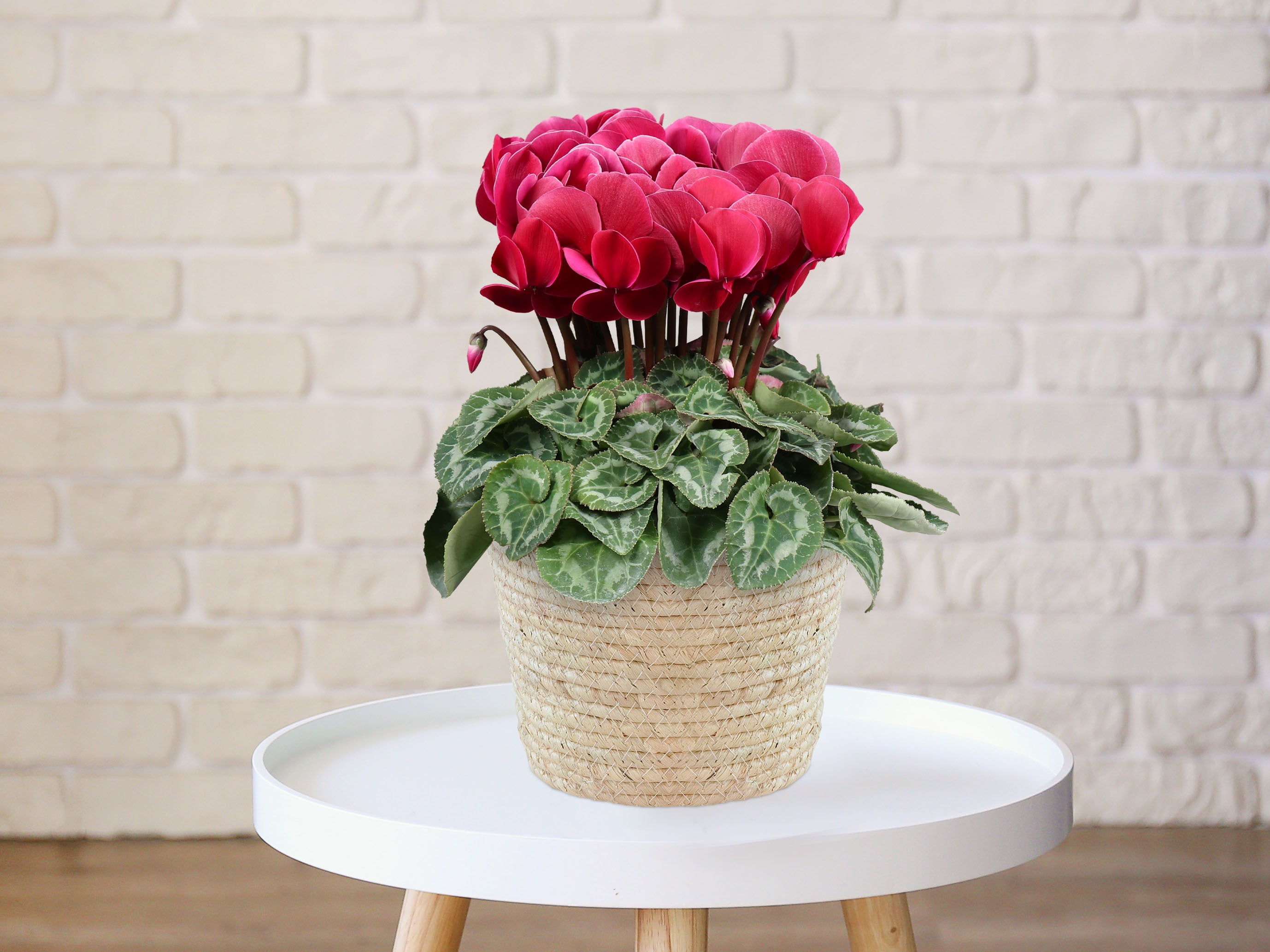 深みのある赤色が印象的なシクラメン。まるで熟した果実のような濃厚な色合いが、冬の空間にシックな華やかさを添えます。大人っぽいインテリアにもよくなじむ、上質な一鉢です。