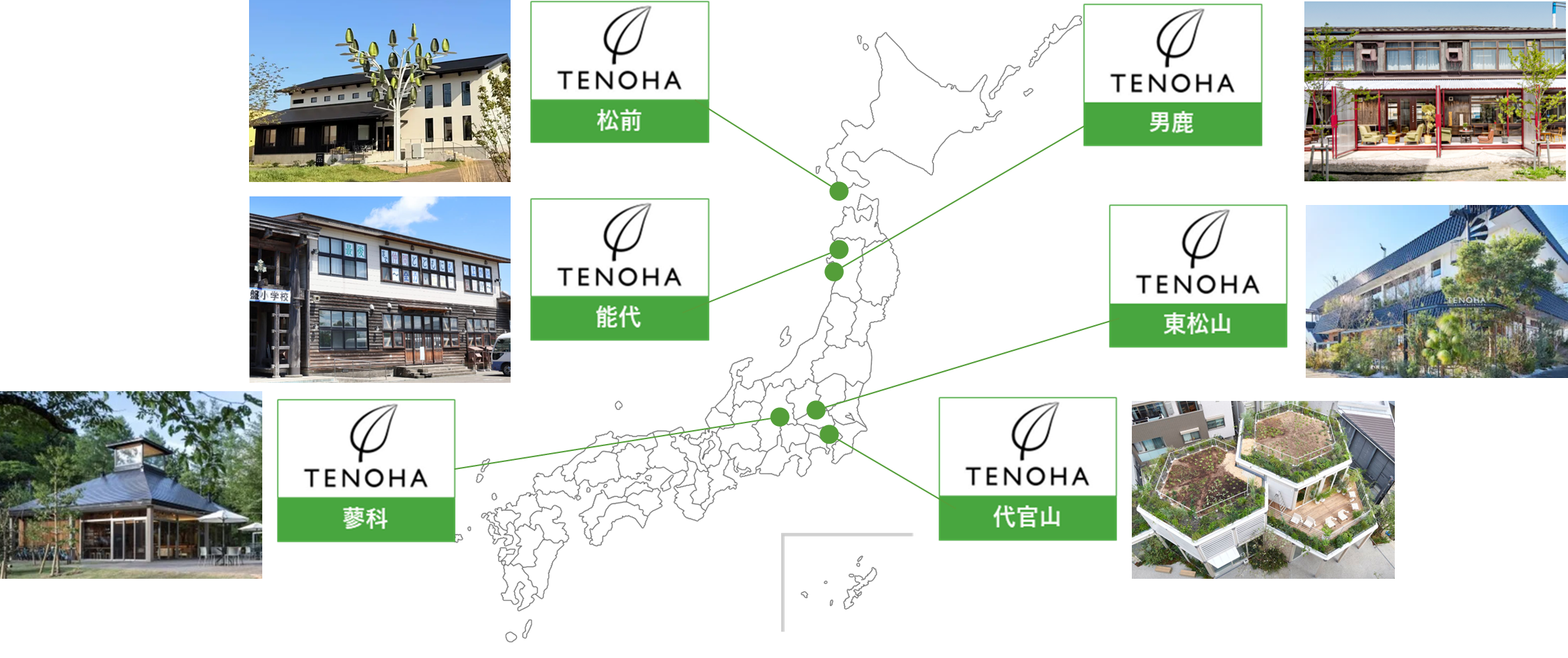 TENOHA(テノハ)は、「手のひら」と「葉」の造語です。施設を大きな木、新しいライフスタイルを沢山の葉として、ものを作り出す手と手が、重なり合う葉のように広がり、新しい時代やものに向けて人やモノ・サービスが育っていく場所であることを表しています。地域の皆様と手と手をたずさえて、沢山の葉を増やし、更に大きな木へと成長して場を目指しています。