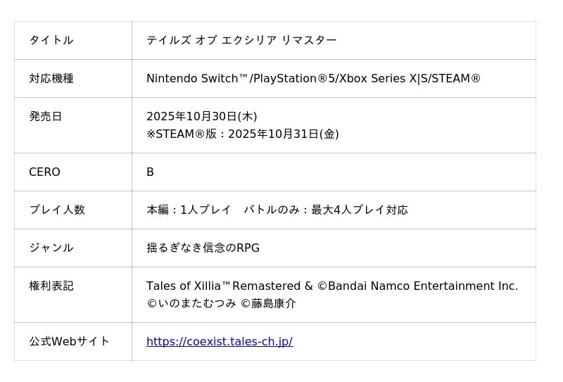 株式会社バンダイナムコエンターテインメントは、Nintendo Switch(TM)/PlayStation(R)5/Xbox Series X|Sにて「テイルズ オブ エクシリア リマスター」を発売したことをお知らせいたします。STEAM(R)版は10月31日(金)に発売いたします。