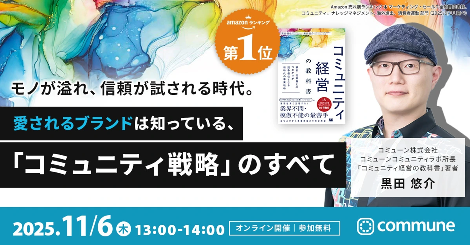 相互交流で信頼を育む「Commune(コミューン)」を提供するコミューン株式会社は、2025年10月20日に刊行した著書『コミュニティ経営の教科書 ~顧客・従業員とのつながりが競争優位となる新時代の事業戦略~』(著者:高田 優哉、黒田 悠介)が、丸善日本橋店、三省堂書店有楽町店、紀伊國屋書店梅田本店の週間ベストセラーにて、それぞれ1位を獲得したことをお知らせいたします。