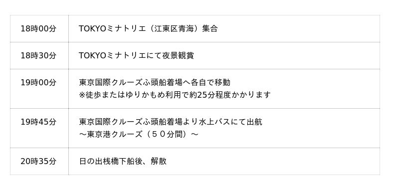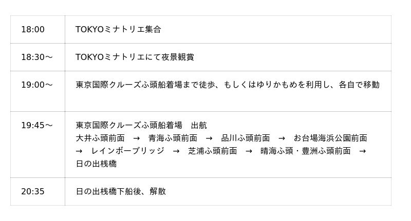 オレンジ色に染まる巨大なガントリークレーンやライトアップされたレインボーブリッジなど、普段見る機会の少ない東京港の夜景を、陸上と海上の両方からご観賞いただけます。