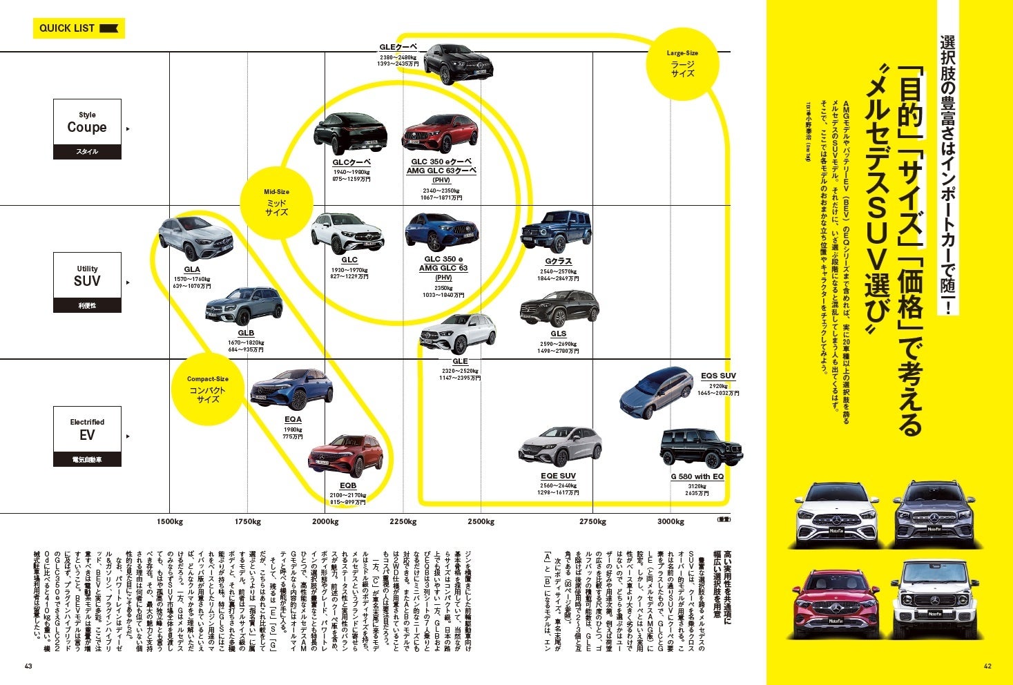 本誌では、世界中で人気の高いメルセデス・ベンツ SUV のオールラインナップ、GLAからGクラスまで全15モデルを徹底解説します。