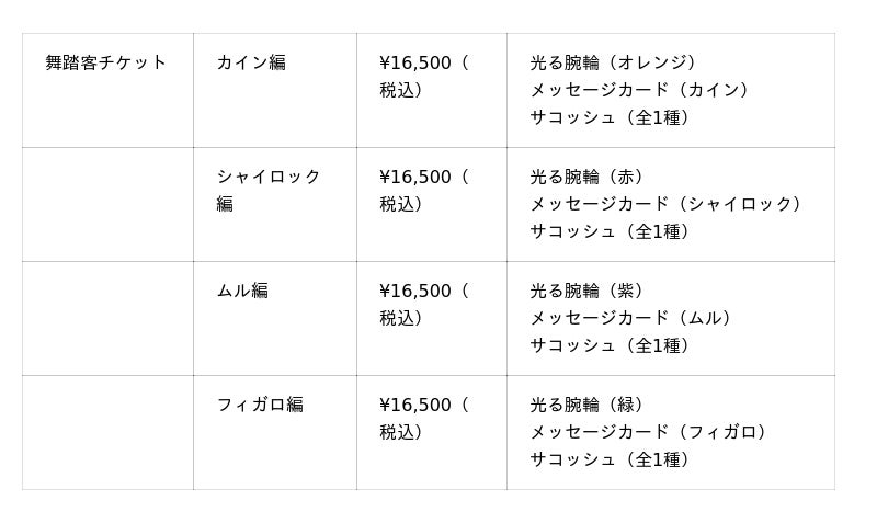 舞踏客チケット……パーティの招待客として、キャストに話しかけられることがあります。公演中は購入時に選択した魔法使いに固定でついていくことになります。