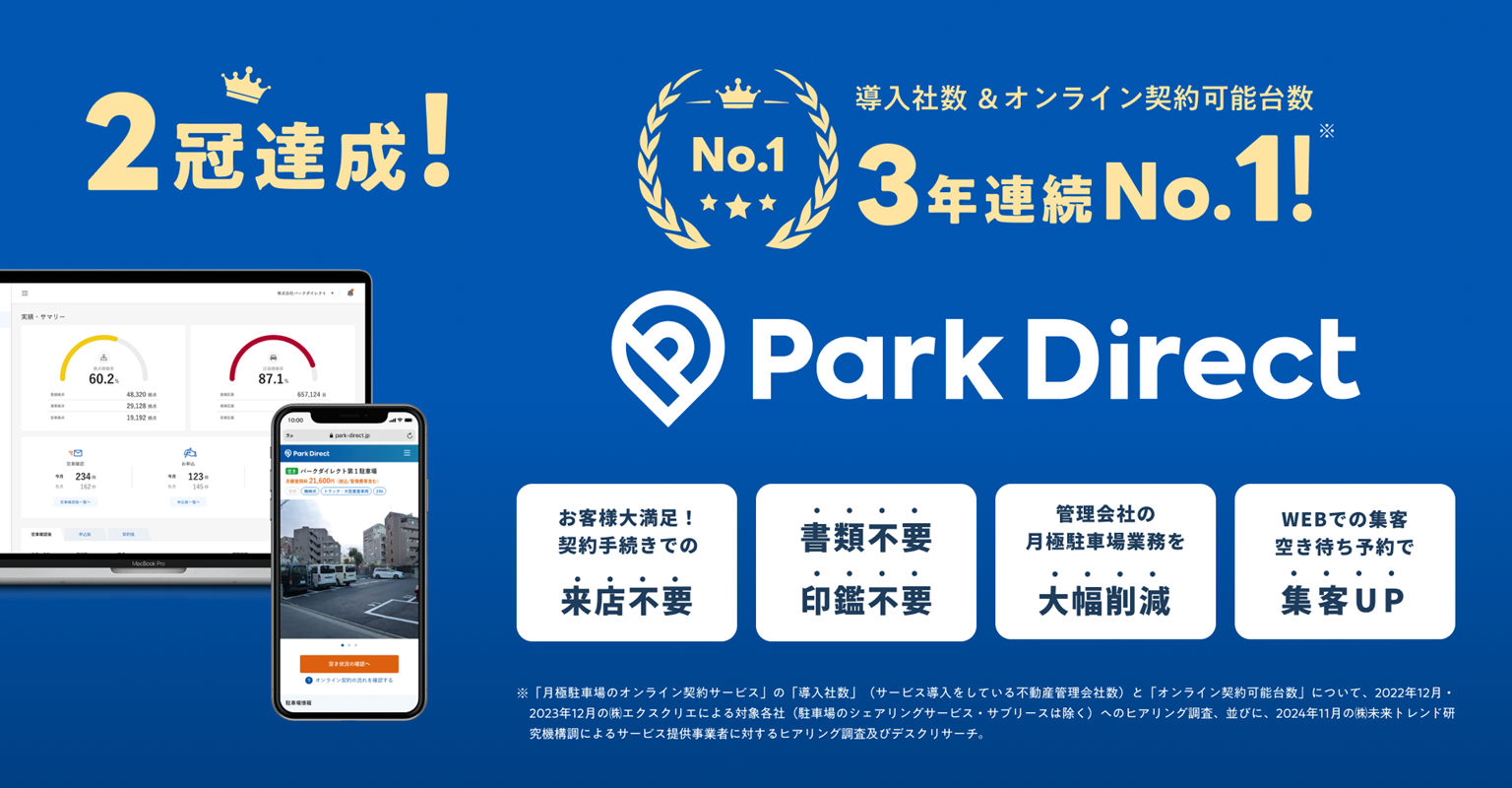 「Park Direct(パークダイレクト)」(https://www.park-direct.jp)は、株式会社ニーリーが運営する、月極駐車場をオンラインで検索・申込・契約できるサービスです。スマホやパソコンから現在地や住所で簡単に検索でき、オンラインで申込、契約、クレジットカードでの決済まで可能。最短約5分で月極駐車場をご利用いただけます。また、希望する駐車場が満車の場合でも「空き待ち予約」をすれば、空きが出た際にお知らせを受け取れます。Park Direct(パークダイレクト)は、オンライン契約可能台数業界No.1!*6