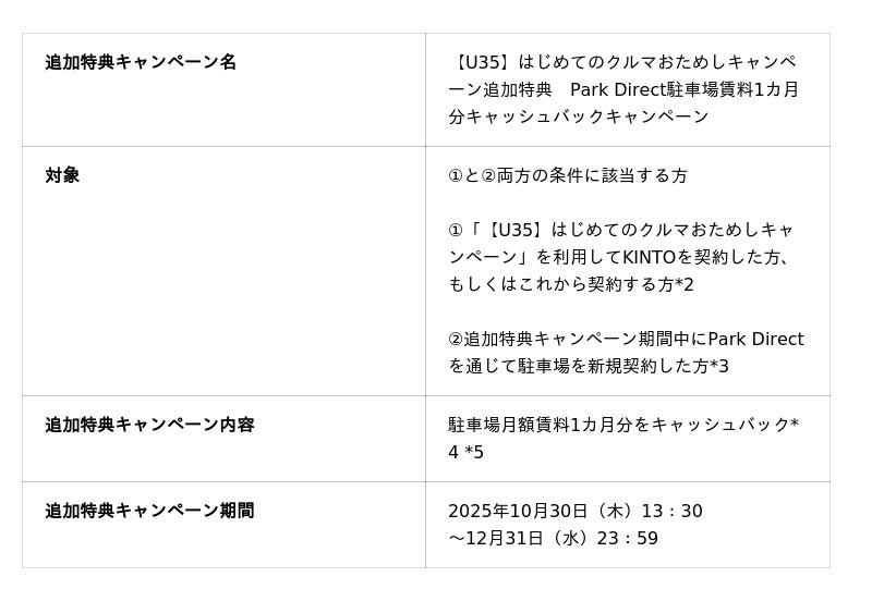 この特典は、「【U35】はじめてのクルマおためしキャンペーン」をご利用中、もしくはこれからご利用いただく方を対象に、追加特典キャンペーン期間中にPark Directで駐車場を新規契約いただくと、駐車場月額賃料1カ月分をキャッシュバックするものです。