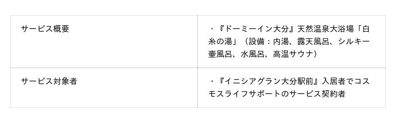 プレミアムサービス分譲マンション『イニシアグラン大分駅前』は、分譲マンション入居者向けサービスの企画・運営を中心事業とする、コスモスイニシアのグループ会社「コスモスライフサポート」が、いつまでも元気に楽しく日常を過ごせるよう愉しみ・便利・繋がり・安心な暮らしを実現する多彩なサービスをコンシェルジュが中心となって提供します。このたび、コスモスライフサポートと共立メンテナンスとの2社間協定により、『イニシアグラン大分駅前』の入居者が、『ドーミーイン大分』の天然温泉大浴場「白糸の湯」を利用できるサービス(有償)の提供も新たに決定しました。