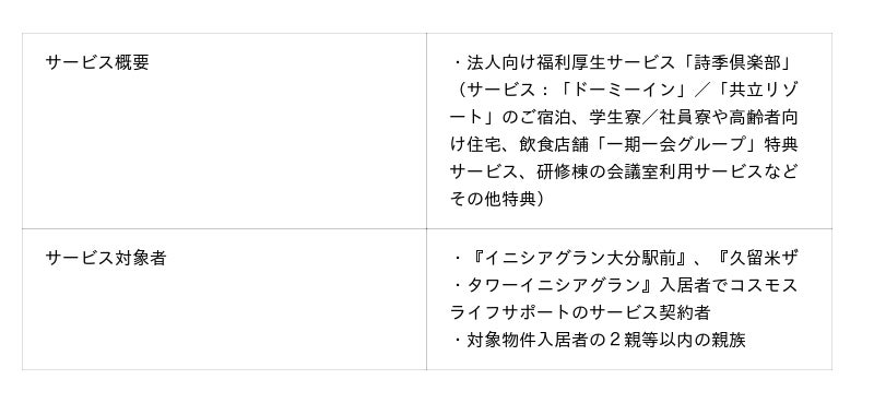 今回、共立メンテナンス、コスモスイニシア、およびコスモスライフサポートの3社間協定により、『イニシアグラン大分駅前』、『久留米ザ・タワーイニシアグラン』の入居者も、「詩季倶楽部」の各種サービスを利用が可能となりました。対象マンションの入居者は、『ドーミーイン』や『共立リゾート』のホテル宿泊のほか、学生寮・社員寮や共立フーズサービスが展開する一期一会グループの利用時など、幅広い施設で特典を受けることが可能です。