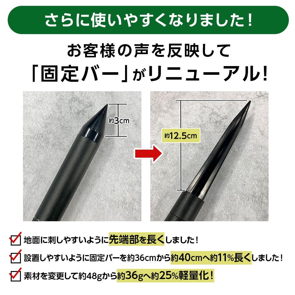 設置の安定性と作業効率を大幅向上!先端が鋭く、約40cmに長くなり、約25%軽量化した新固定バーで、畑や庭への動物対策がより手軽に!