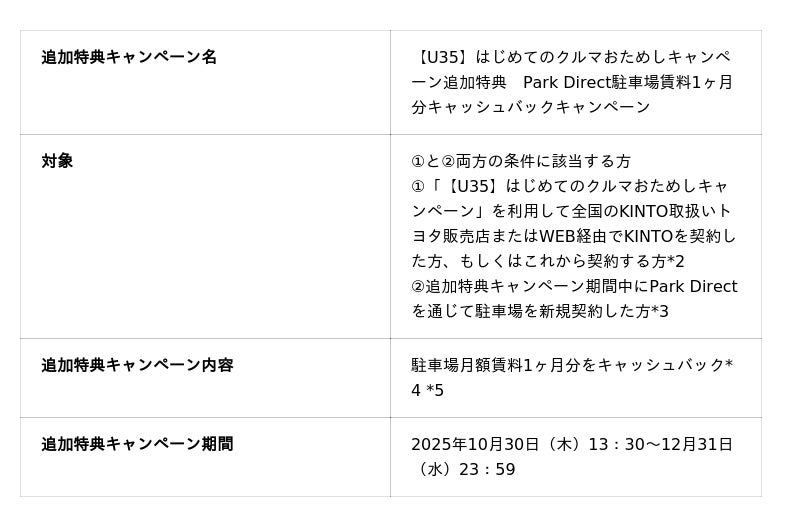 この特典は、全国のKINTO取扱いトヨタ販売店またはWEB経由で「【U35】はじめてのクルマおためしキャンペーン」をご利用中、もしくはこれからご利用いただく方を対象に、追加特典キャンペーン期間中にPark Directで駐車場を新規契約いただくと、駐車場月額賃料1ヶ月分をキャッシュバックするものです。