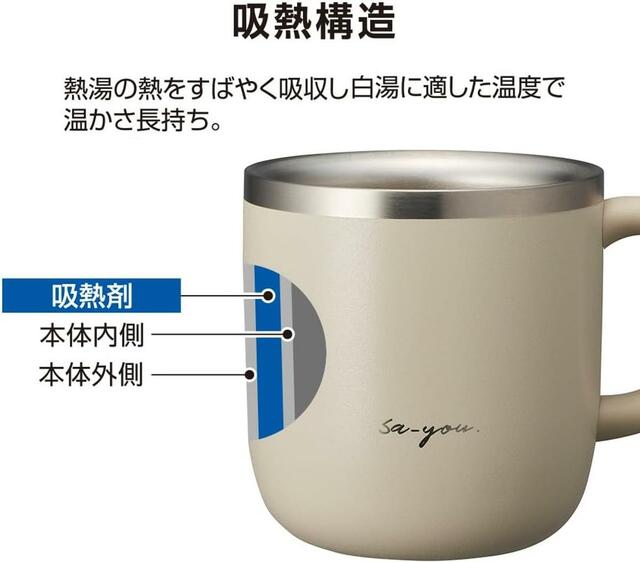 吸熱剤に蓄えられた熱と断熱構造のおかげで、飲み頃になった白湯は、そのまま約1時間保温してくれます。温度が下がりすぎる前に飲み切ることができるので、「せっかく作ったのに冷めてしまった…」なんてストレスとも無縁です。
