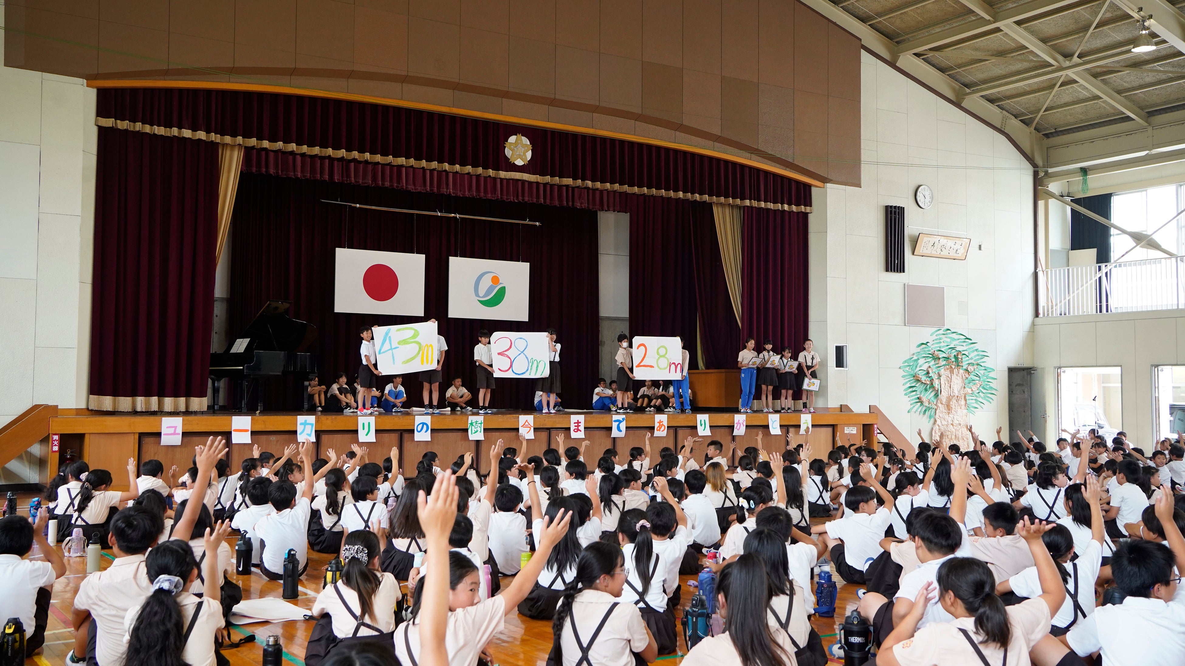 2025年7月3日、桜井小学校では地域の方々や卒業生を招き、「ユーカリの樹、いままでありがとう集会」を開催。児童たちがユーカリにまつわるクイズや劇、感謝のメッセージ発表を行い、校歌の一節「ユーカリの 木のように どっかりと こしをすえ」に込められた誇りを胸に、温かく見送りました。