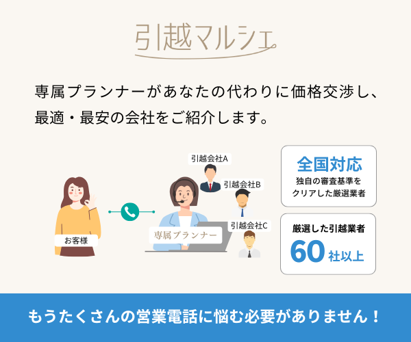 ■次世代型引越サービス「引越マルシェ」について「引越マルシェ」は、専任の引越プランナーが、選択肢が多く煩雑な「引越し」について丁寧にご説明をし、全国各地60社以上の引越会社との提携を活かして、お客様にあった最適な引越プランをご提案すると共に、引越に伴い発生する煩雑な事務作業をサポート、代行をさせて頂くサービスです。